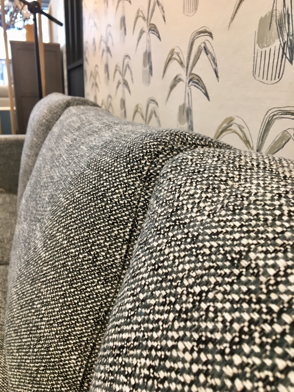 Nous avons décidé de vous faire partager nos nouveaux coups de coeur : les peintures Argile, des peintures éco-label et au process artisanal, et les tapisseries Scion. Sur la porte vitrée, nous avons utilisé le Noir de Vigne de chez Argile et pour le mur derrière le canapé, nous avons pioché le modèle Crassula Putty/Slate de la collection Zanzibar de Scion. Nous leur consacrerons bientôt un article mais vous pouvez d’ores et déjà les découvrir dans notre magasin car nous avons utilisé plusieurs autres teintes et collections de ces deux marques pour la création de nos différentes ambiances.