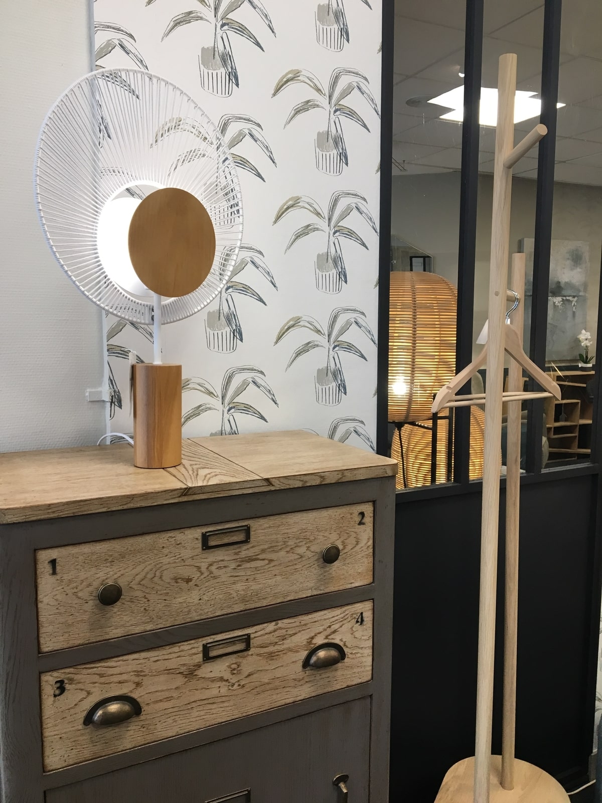 - Chiffonnier Indus 66 x 40 x 122cm, porte-manteaux Dugeot 60 x 30 x 191cm, lampe Oyster Forestier