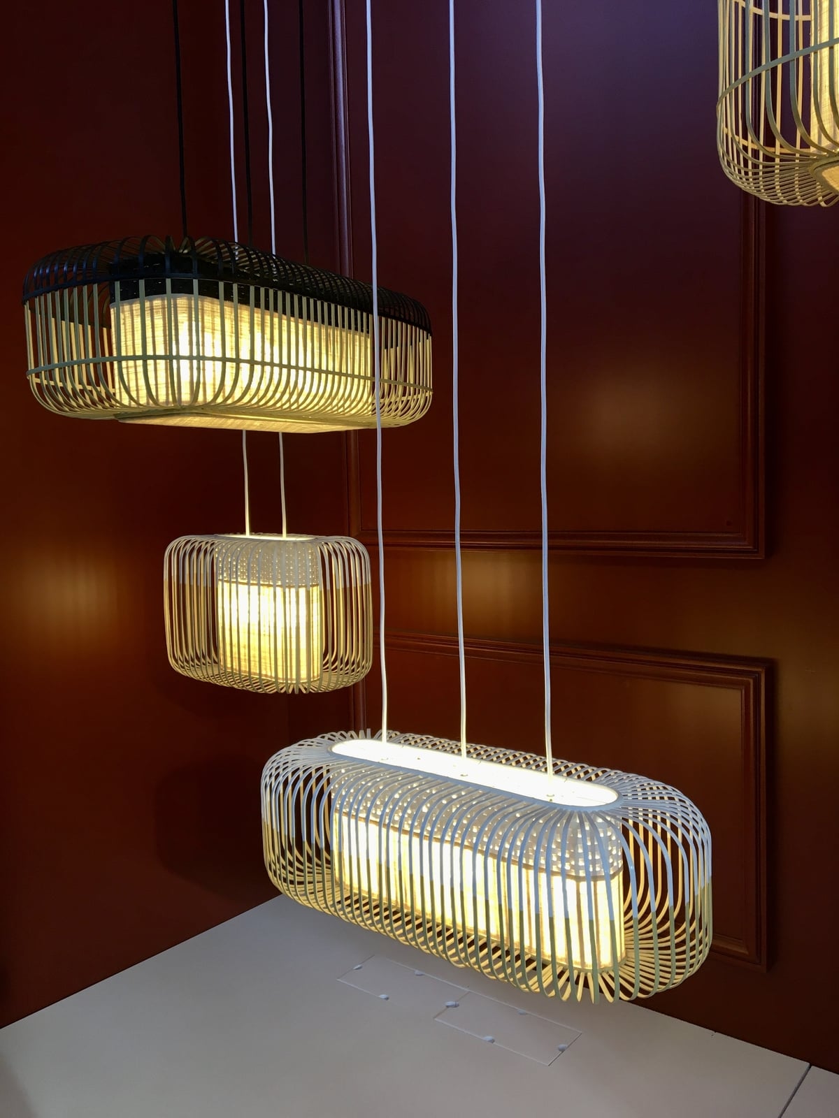 - Suspension en bambou « Bamboo » de Forestier, au format rectangulaire, avec plusieurs ampoules.