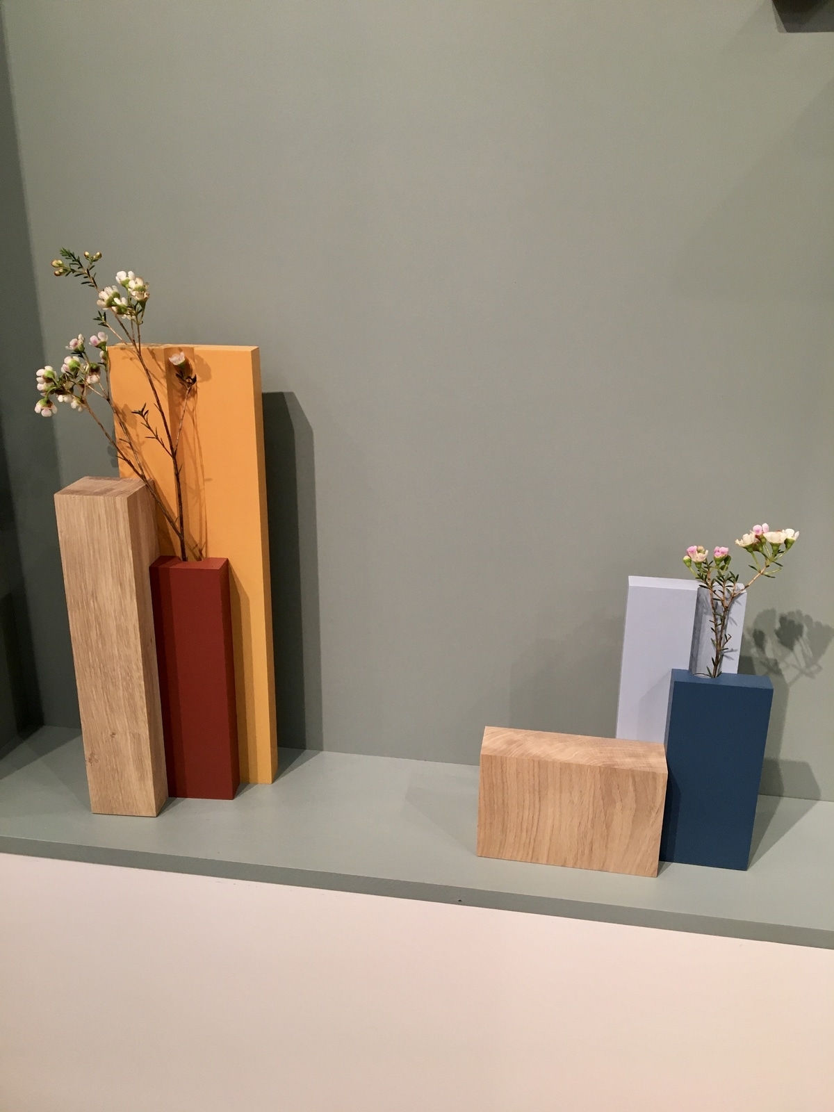 - Vases Drugeot, en chêne naturel, et tubes à essai.