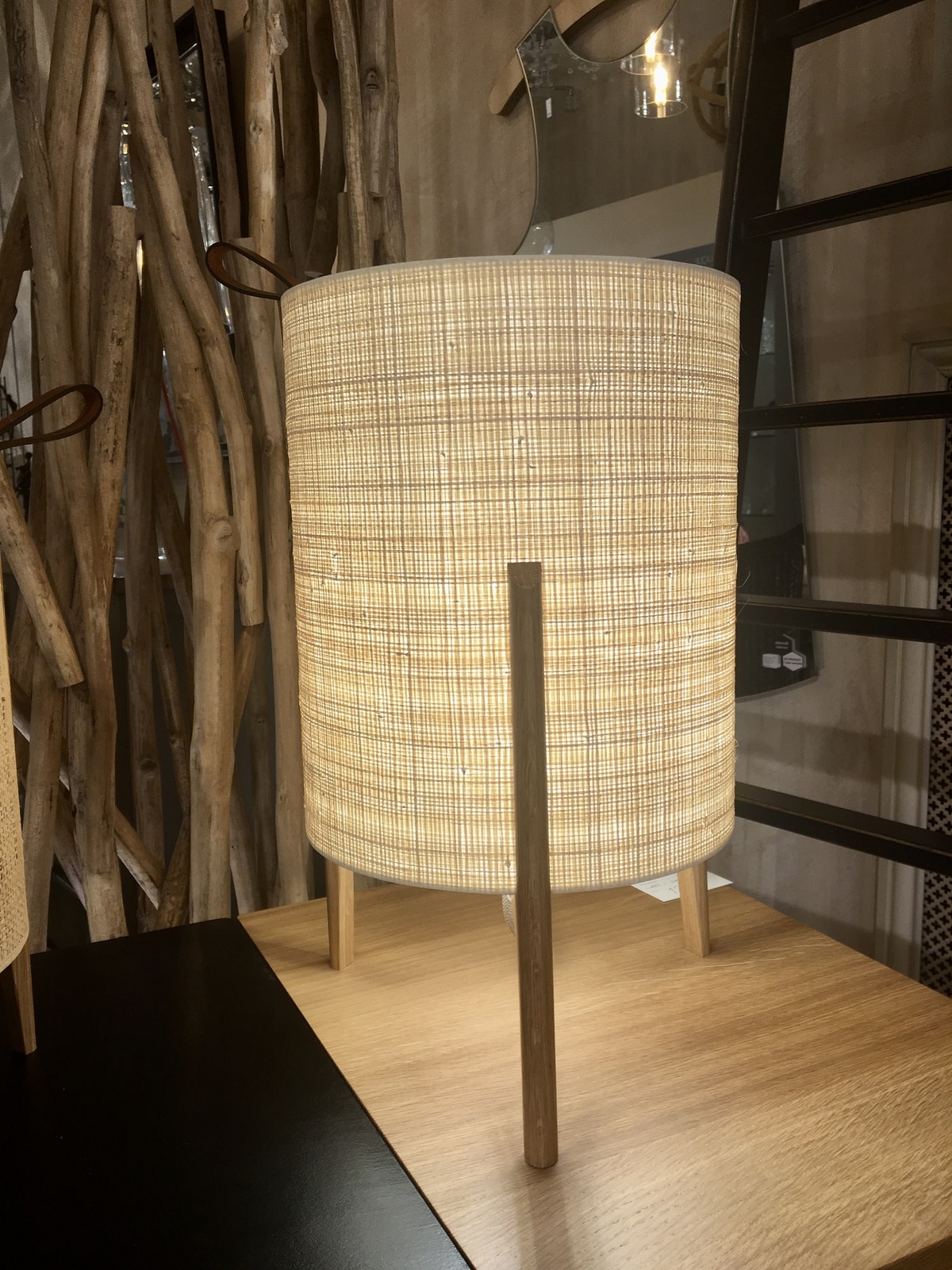 Autre collection Carpyen, la ligne Greta joue sur les matières naturelles : pied en chêne naturel, abat-jour en feuilles de bananier et poignées en cuir. Nous avons en stock les dimensions suivantes : diamètre 20 cm x hauteur 33 cm et diamètre 26 cm x hauteur 44 cm. Sur commande : diamètre 33 cm x hauteur 58 cm, et pied en chêne noir et abat-jour blanc.
